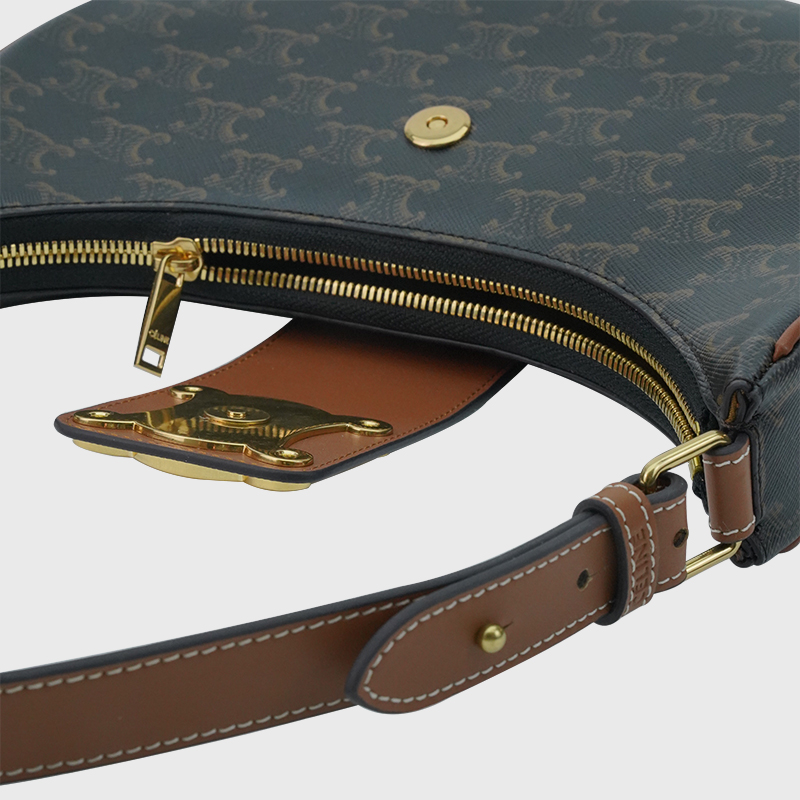 9 x 3 x 7英寸(22 x 7.5 x 17厘米) Triomphe Canvas标志印花 人造革 织物衬里 金色 肩背和手提 拉链开合 皮革翻盖,配TRIOMPHE磁扣 1个内侧扁平口袋 可调节肩带,最小长度8英寸(22厘米),最大长度9英寸(23厘米) 编号:114493.01LH